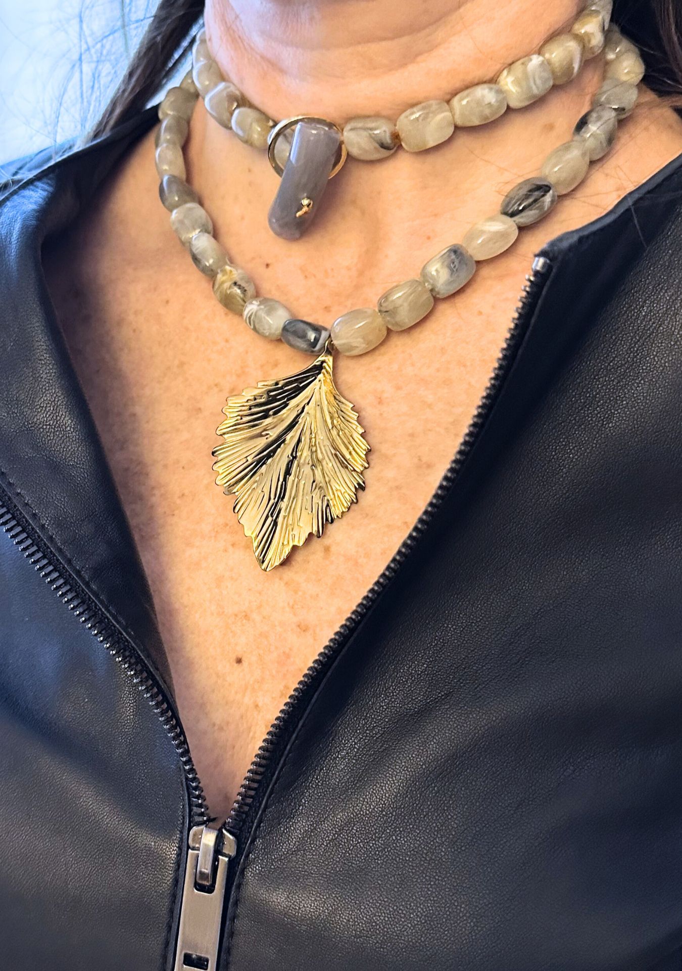 Collar largo con doble altura con piedras en tonos grises y azules junto con un charm dorado de hoja otoñal