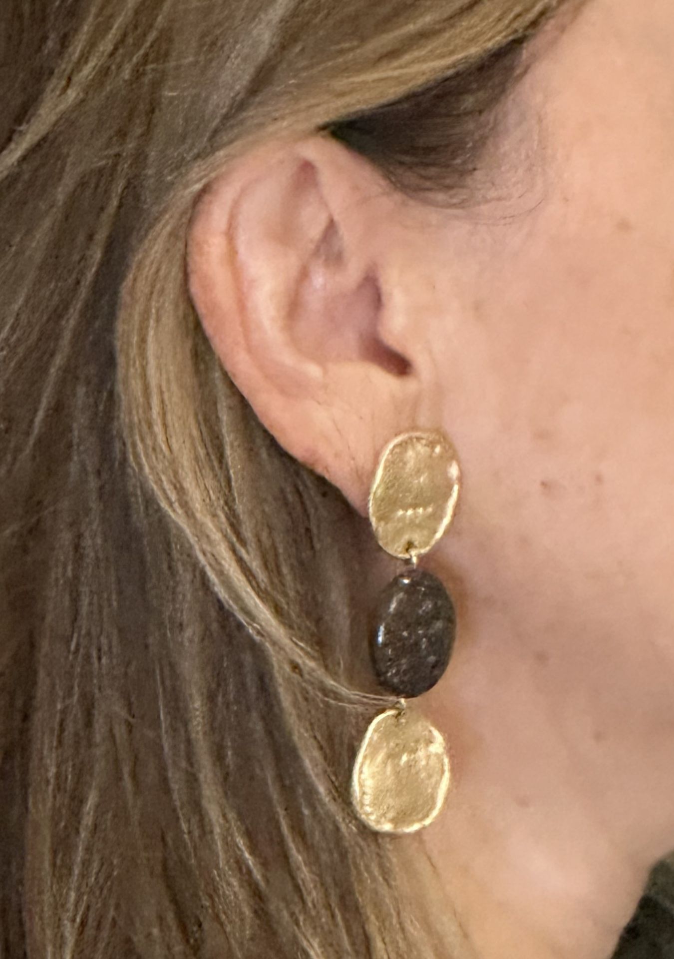 Pendientes en tono dorado con piedra gris en tres alturas. Ideal para potenciar cualquier look