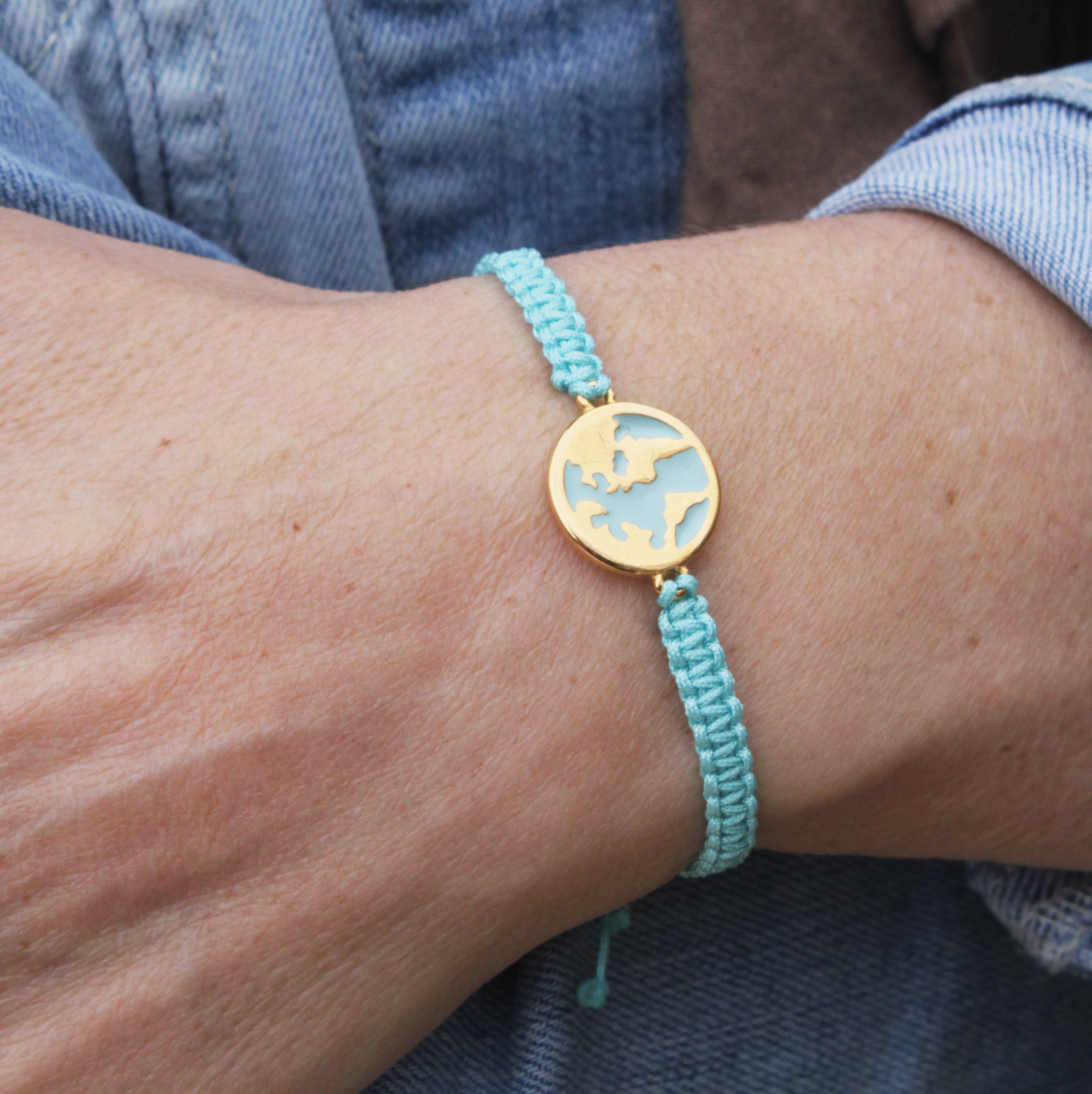 Pulsera de macramé con chapa del planeta Tierra bañada en oro de 24K.Hecha a mano, personalizable y cargada de significado.Un símbolo de estilo, conciencia y conexión con el universo.